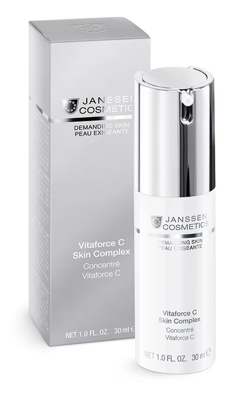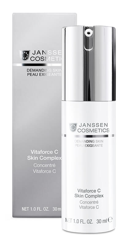 Βιταμίνη C Ορός Προσώπου Vitaforce C Skin Complex της Janssen Cosmetics είναι ένα πλούσιο αντιοξειδωτικό συμπύκνωμα βιταμίνης C σε μορφή gel-serum, σχεδιασμένο να ενισχύει την νεότητα, λάμψη και ομοιογένεια της επιδερμίδας. Με σταθεροποιημένη βιταμίνη C, υαλουρονικό οξύ και εκχύλισμα λεμονιού, αυτό το προϊόν συμβάλλει στη βελτίωση του τόνου, την ενυδάτωση και τη λείανση των λεπτών γραμμών, ενώ ταυτόχρονα προστατεύει από πρόωρη γήρανση και ελεύθερες ρίζες.